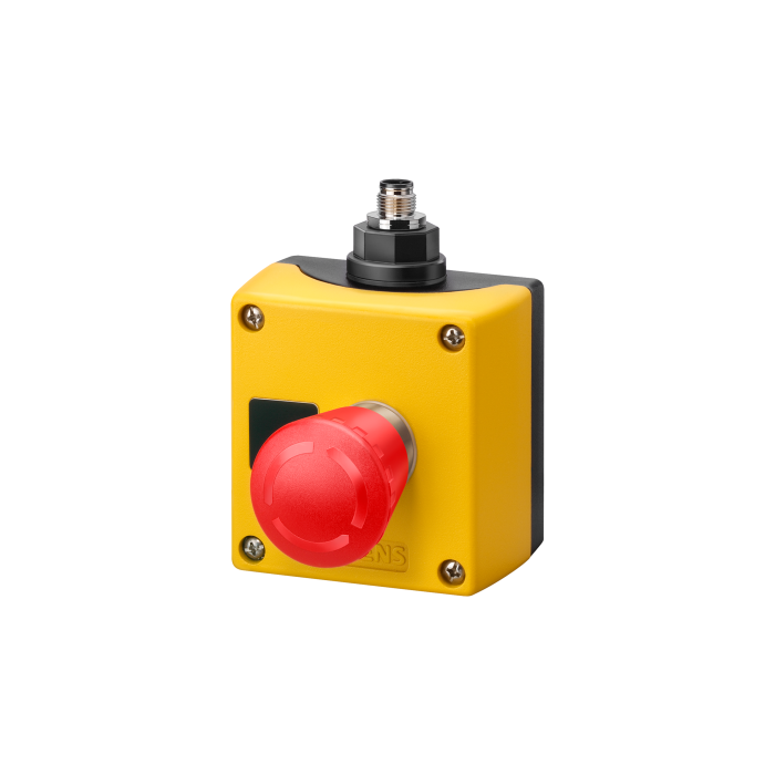 AS-Interface enclosure for command devices, 22 mm, round, Enclosure material metal, Enclosure top part yellow, without protective collar, 1 control point, A=emergency stop mushroom pushbutton red, 40 mm, rotate-to-unlatch, 1 NC, 1 NC, label: EMERGENCY STOP, enclosed separately de/en, M12 connector on top
