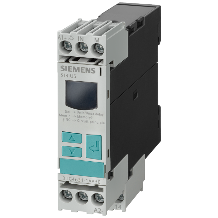 Digital monitoring relay Voltage monitoring, 22.5 mm from 0.1-60 V AC/DC 0vershoot and undershoot Supply voltage: 24 V AC/DC 50 to 60 Hz DC and AC without galvanic isolation to measuring circuit Noise pulses delay 0.1 to 20 s Hysteresis 0.1 to 30 V 1 change-over contact with or without fault buffer screw terminal Successor product for 3UG3531-1AC..