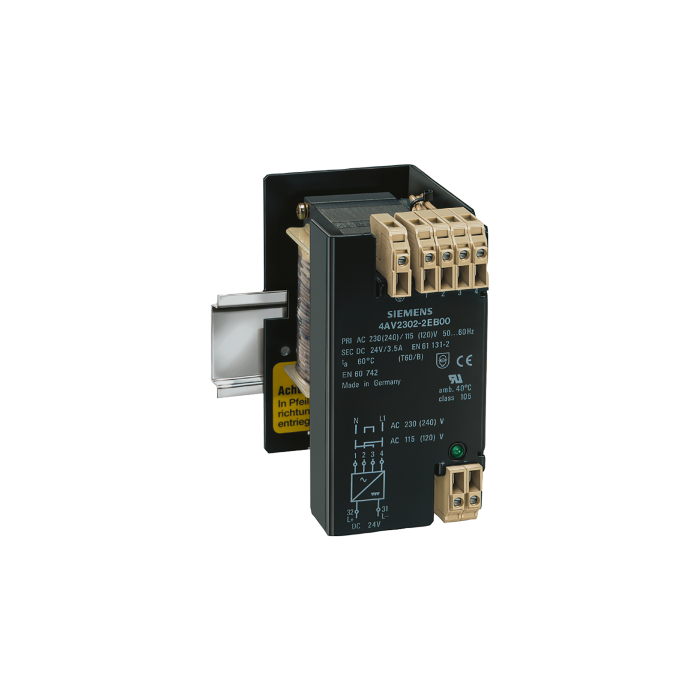 POWER SUPPLY; PHASES:1; PN(KW):0,084; UPRI(V):230-115; USEC(V DC):24; ISEC(A DC):3,5/4,2 (60/40 CEL); F(HZ):50...60; VECTOR GR./SHIELD WNG.:II0 /0; PROTECTION CL.:I; TA/ISOKL:60 /B; W(%):5; IP00; TYPE OF TERMINALS:SCREW/TAB CONNECTION; INSTALLATION:MOUNTING RAILS; EN 61558-2-6, EN61131-2 >SAFETY ISOLATING TRANSFORMER<