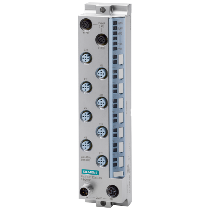 SIMATIC ET 200eco PN, DQ 8x 24 V DC/0.5 A, M12-L, 8x M12, single and double assignment, source output (PNP,switching to P potential), substitute value output, channel diagnostics for open circuit and short circuit at the output, shared device with 2 controllers, 0.25 ms isochronous mode, prioritized startup, MSO, MRP, S2 redundancy, I&M0...3, degree of protection IP67