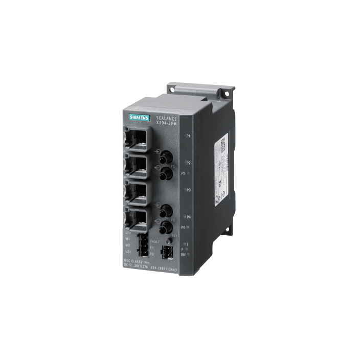 SCALANCE X204-2FM, FO monitoring managed IE switch, 4x 10/100 Mbit/s RJ45 ports, 2x 100 Mbit/s multimode BFOC, LED diagnostics, error signaling contact with set pushbutton, redundant power supply, PROFINET IO device, network management, can be operated in redundant ring, incl. electron. manual on CD-ROM, C-plug optional. SCALANCE X204-2FM, FO Monitoring managed IE Switch, 4x 10/100 Mbit/s RJ45 ports, 2x 100 Mbit/s multimode BFOC, LED diagnostics, error signaling contact with set button, Redundant power supply, PROFINET IO device, network management, can be operated in redundant ring, incl. electron. manual on CD-ROM, C-plug optional