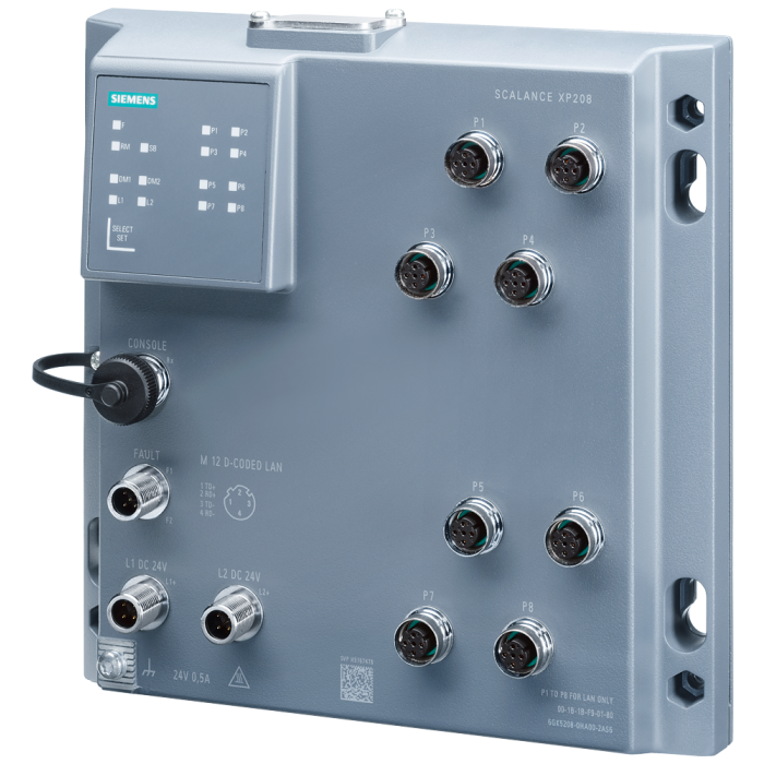 SCALANCE XP208 (EIP), managed IE switch, 8x 10/100 Mbps M12 ports, IP65, LED diagnostics, error signaling contact, redundant power supply, IEC 62443-4-2 certified; Ethernet/IP, network management, including dust caps, including electronic manual on CD-ROM, C-plug optional