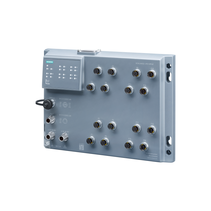 SCALANCE XP216 (EIP), managed IE switch, 12x 10/100 Mbps IEC 62443-4-2 certified; M12 ports, 4x 10/100/1000 Mbps M12 ports IP65, LED diagnostics, error signaling contact, redundant power supply, Ethernet/IP, network management, incl. dust caps, incl. electronic manual on CD-ROM, C-plug optional