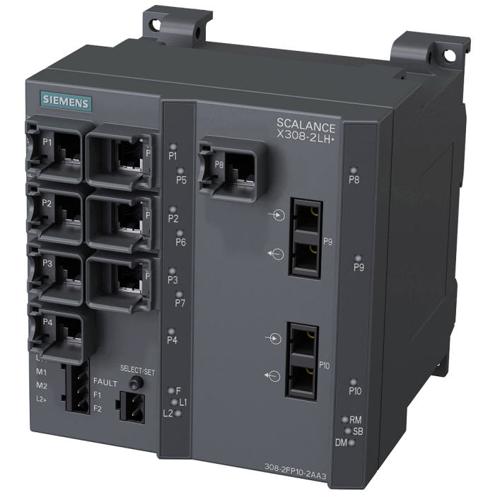 SCALANCE X308-2LH+ managed plus IE switch, 2x 1000 Mbit/s SM SC, 1x 10/100/1000 Mbit/s, 7x 10/100 Mbit/s RJ45 ports, LED diagnostics, error signaling Contact with select/set button, PROFINET IO device, network management, Integrated redundancy manager, office features (RSTP, VLAN, IGMP,..) C-plug in scope of delivery