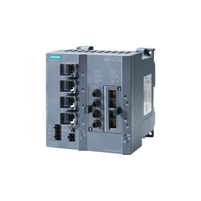 SCALANCE X308-2M PoE; managed IE switch, compact; 4x 10/100/1000 Mbit/s for RJ45 ports electrical with PoE; 2x 100/1000 Mbit/s for 2-port media modules, electrical or optical; LED diagnostics, error signaling Contact with select/set pushbutton, PROFINET IO device, network management, Integrated redundancy manager, office features (RSTP, VLAN, IGMP,..) C-plug in scope of supply.