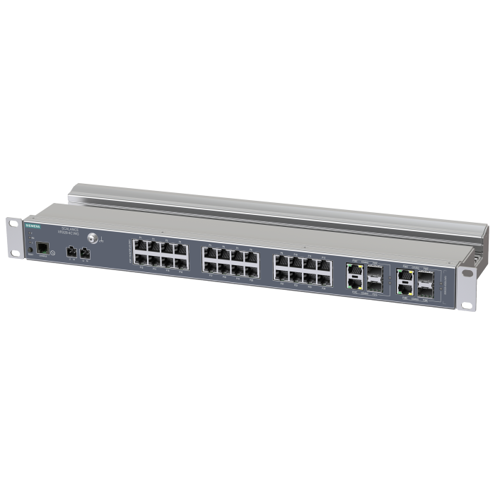 SCALANCE XR328-4C WG; managed IE switch; 19" rack; 24 x 10/ 100/1000 Mbps electrical ports; 4 x 1000 Mbps combo ports electrical or optical; LED diagnostics; reset button; console port; PROFINET device; network management function; redundancy manager; power supply 24 V DC; IEC 62443-4-2 certified;