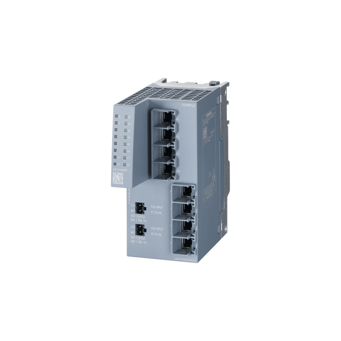 PE408PoE Port Extender for SCALANCE XM-400 managed modular IE switch; extension by 8x 10/100/1000 Mbit/s RJ45 with up to 8 ports PoE according to IEEE802.3AT; for PoE separate power supply required