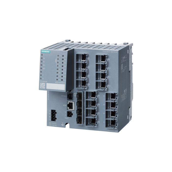 SCALANCE XM416-4C; managed modular IE switch; 16x 10/100/1000 Mbit/s RJ45; 4x 100/1000 Mbit/s SFP; contains 4 combo ports; in total 16 ports can be used; expandable to 24 ports electrical or optical; assembly: DIN rail/S7 mounting rail, PROFINET IO device; redundancy functions; office features (RSTP, VLAN, IGMP,..); C-plug in scope of delivery; Layer 3 integrated;