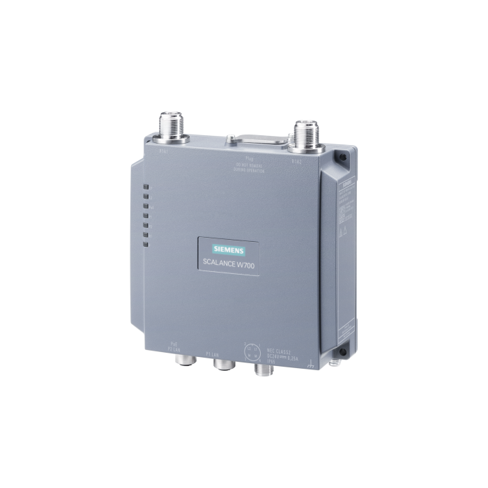 IWLAN client, SCALANCE W738-1 M12, 1 radio, 2 N-CON antenna port, iFeatures support via key plug, IEEE 802.11a/b/g/h/n, 2.4/5 GHz, gross data rate 300 Mbit/s, 2x M12 max. 100 Mbit/s, PoE integrated 2-port switch, redundant 24 V DC,M12 A-coded IP65, -20... 60 -¦C, plug slot WPA2/802.11i/e, observe national approvals! CERT ID: MSN65-W1-M12-E2 Scope of delivery: Manuals on CD-ROM, English/German; M12 sealing caps, for operation in the USA