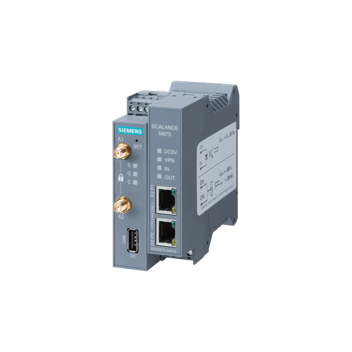 SCALANCE M875-0 UMTS router; for wireless IP communication from Ethernet- based automation devices via UMTS mobile radio HSDPA and HSUPA support Security features: IPsec, Firewall; for mobile applications for use in Japan; 1x digital input, 1x digital output; observe national approvals. SCALANCE M875-0 UMTS-ROUTER; FOR THE WIRELESS IP-COMMUNICATION OF ETHERNET- BASED PLCS VIA UMTS MOBILE COMMUNICATIONS HSDPA AND HSUPA SUPPORT SECURITY FEAT.:IPSEC,FIREWALL FOR MOBILE APPLICATIONS TO BE USED IN JAPAN 1XDIG. INPUT, 1XDIG.OUTPUT NOTE NATIONAL APPROVALS