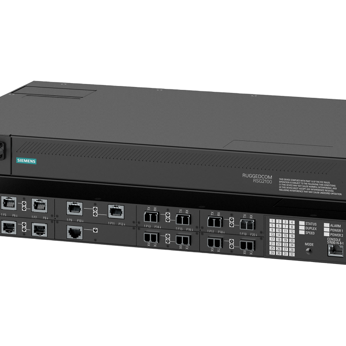 RUGGEDCOM RSG2100 is an industrially hardened, fully managed Ethernet switch; 128-bit Encryption; Up to 3-Gigabit Ethernet ports copper and/or fiber; Up to 16-Fast Ethernet ports copper and/or fiber; 2 port modules for tremendous flexibility; Non-blocking, store and forward switching; Supports many types of fiber (multimode, singlemode, Bi-directional single strand) Long haul optics allow Gigabit distances up to 70km Multiple connector types (ST, MTRJ, LC, SC, RJ45, micro-D)