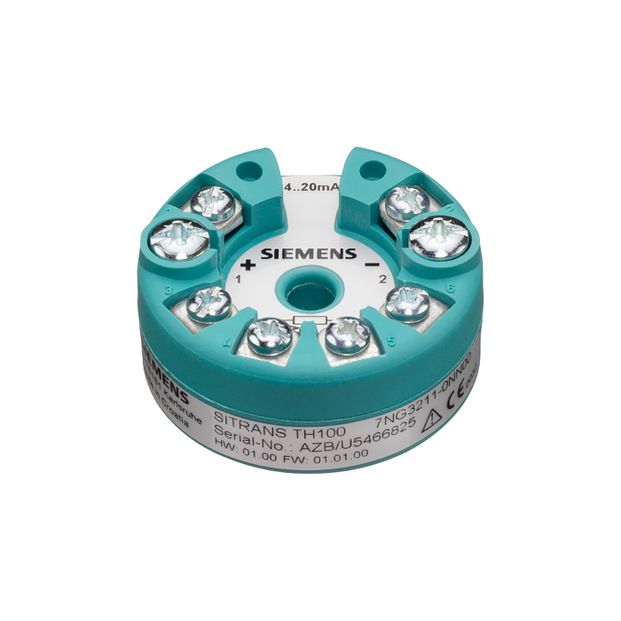 Temperature transmitter SITRANS TH100 for PT100 for installation in connection head Type B (DIN 43729), two-wire system, 4...20 mA, programmable, without electrical isolation Without explosion protection . .