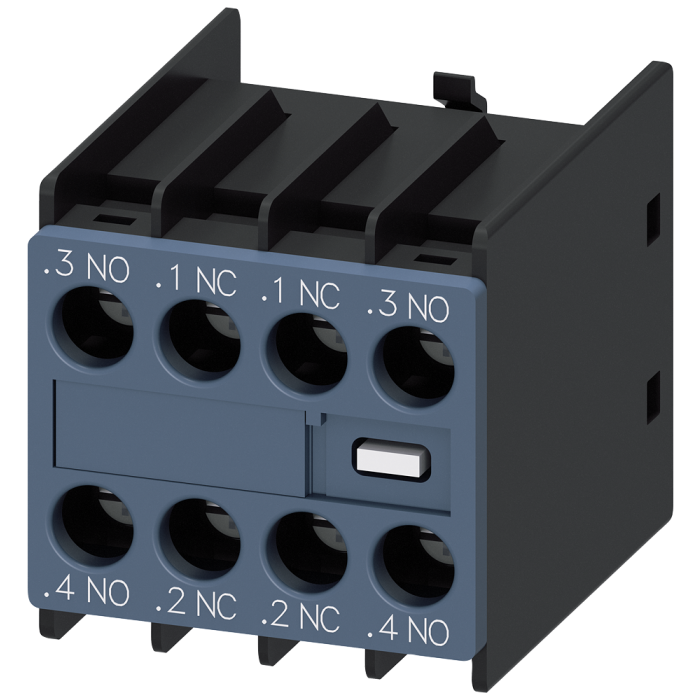 Auxiliary switch on the front, 2 NO + 2 NC Current path 1 NO, 1 NC, 1 NC, 1 NO for 3RH and 3RT screw terminal .3/.4, .1/.2, .1/.2, .3/.4