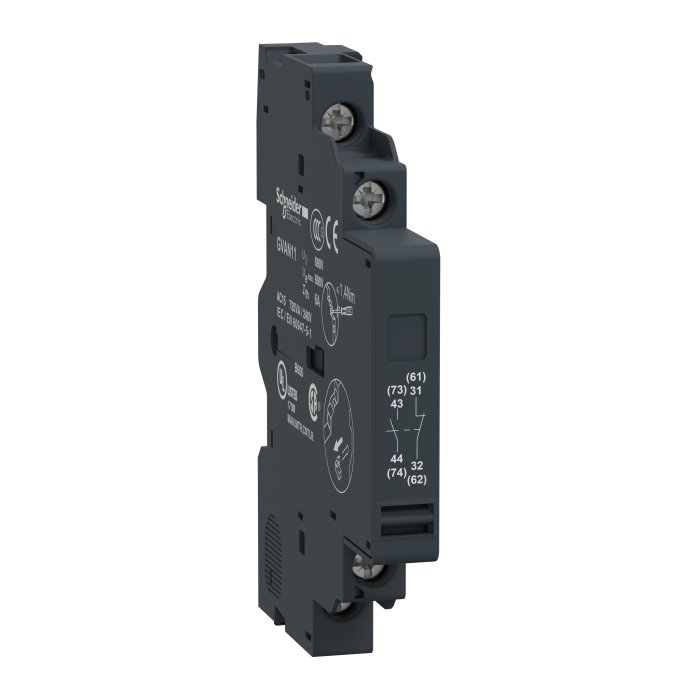 Introducing the Auxiliary contact N/O + N/C - Side, designed specifically as an accessory for Schneider Electric's TeSys GV2 series. This reliable component offers both Normally Open (N/O) and Normally Closed (N/C) configurations, providing flexibility and efficiency in various electrical applications.